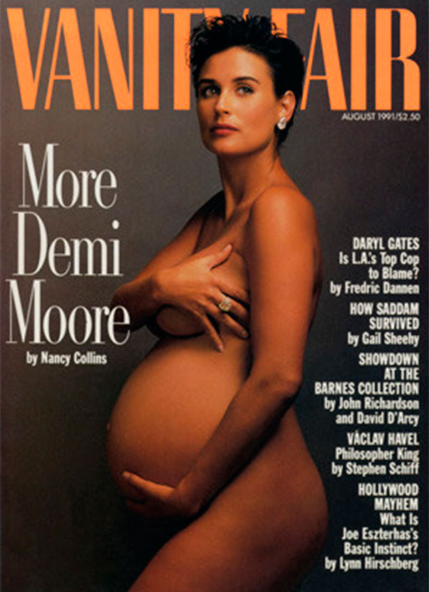 Em 1991, Demi posou para a capa da revista norte-americana nua e mostrando o barrigão de grávida de Scout Willis - a capa foi, inclusive, copiada por várias famosas conforme os anos se passaram.