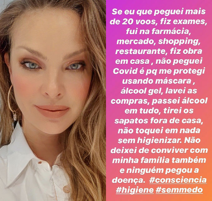 Se eu que peguei mais de 20 voos, fiz exames, fui a farmácia, mercado, shopping, restaurante, fiz obra em casa não peguei Covid é porque me protegi, usando máscara, álcool gel, lavei as compras, passei álcool em tudo, tirei os sapatos fora de casa, não toquei em nada sem higienizar. Não deixei de conviver com minha família também e ninguém pegou a doença, postou no Instagram Stories.