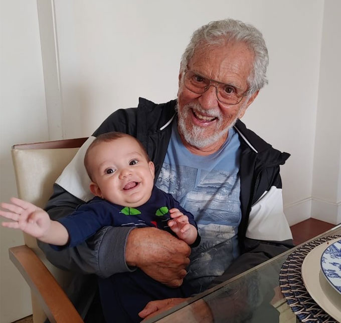 - Estou um bisavô babão. No primeiro momento, quando ele me viu, ele chorou. Mas, tadinho, ele estava desde que nasceu trancado em casa, então estranhou ver outras pessoas. Mas depois foi só alegria. Ele almoçou aqui em casa, fez uma bagunça danada, jogando comida no chão. Sentamos na sala e brincamos bastante. Ele riu, puxou minha barba. Ele é lindo. Que felicidade em tê-lo aqui pertinho de mim.