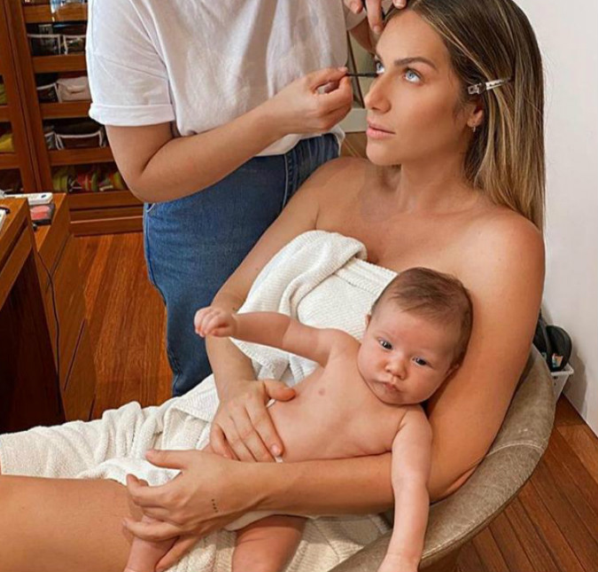 Desta fez, a apresentadora mostrou em seu Instagram o momento em que estava sendo maquiada e Zyan, o filho mais novo dela com Bruno Gagliasso, está sendo segurado no colo.