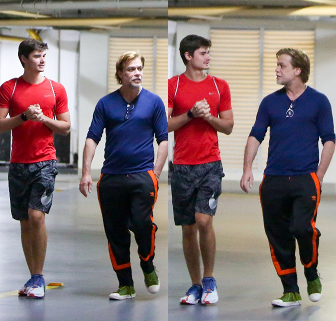Sem se importarem com a presença dos fotógrafos, pai e filho bateram papo enquanto andavam pelo o estacionamento do estabelecimento. Vestindo look esportivo, como se tivesse acabado de sair da academia, João chamou a atenção pela beleza e ostentou o corpão com a camiseta vermelha apertada e shorts. Já o paizão apostou na cor azul e calça preta.