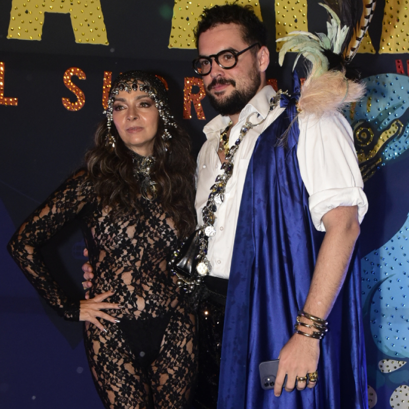 Exibindo o corpão com um belíssimo visual repleto de pedrarias, Alinne estava toda sorridente enquanto abraçava e trocava algumas palavras com o casal. A dupla optou por não combinar o visual, com Reymond vestindo um terno vermelho e Goldfarb um vestido prateado de tecido brilhante.